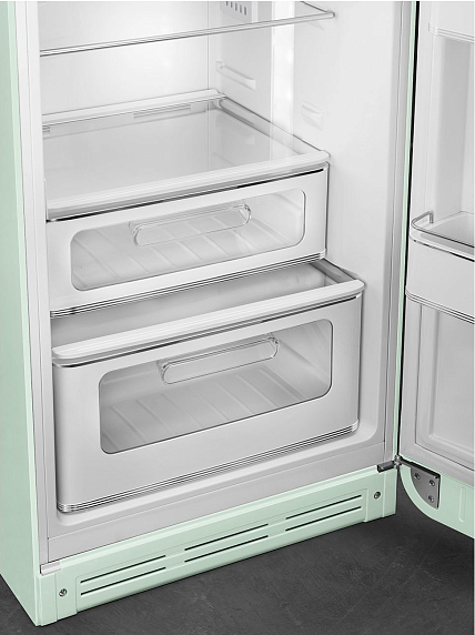 Холодильник Smeg FAB30RPG5 из коллекции «Стиль 50-х годов» выполнен в зеленом цвете. Полки из закаленного стекла отличаются долговечностью и простотой в уходе. Вентилятор в холодильной камере равномерно распределяет холодный воздух, что обеспечивает качественное охлаждение продуктов. При отключении электроэнергии прибор сохраняет температуру на протяжении 30 часов.