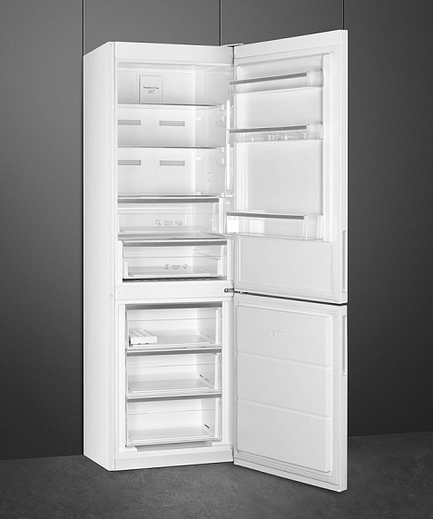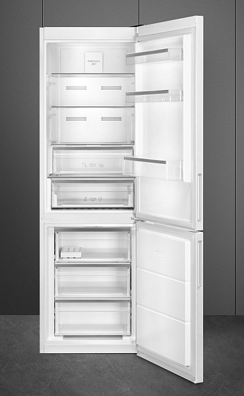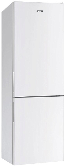 Холодильник Smeg FC20EN1W — великолепная отдельностоящая двухкамерная модель белого цвета. Он имеет систему охлаждения NoFrost, благодаря чему на стенках не образуются отложения инея и льда. Это не просто облегчает уход за прибором, поскольку нет необходимости в частых разморозках, но и помогает экономично использовать электроэнергию. Электронное управление, снабженное дисплеем, позволяет задать нужную температуру с точностью до градуса, а при ее повышении, например, при оставленной дверце, предусмотрен акустический сигнал, привлекающий внимание.