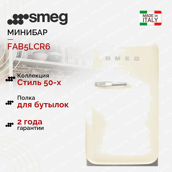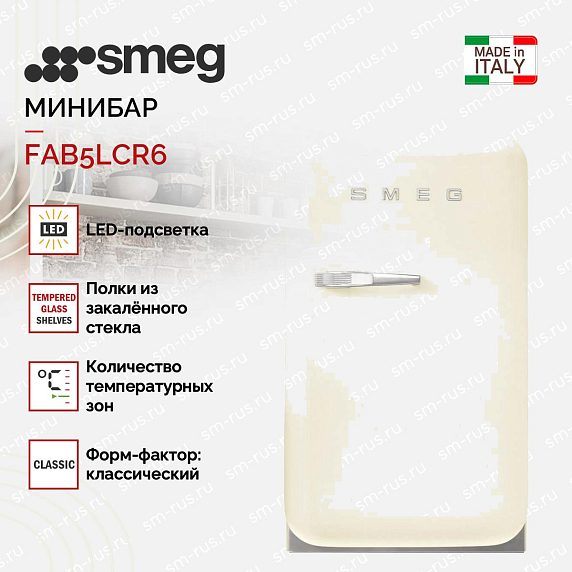 Минибар Smeg FAB5LCR6 в стиле 50-х годов привлекает внимание плавными линиями и винтажной эстетикой, органично вписываясь в интерьер тех, кто ценит ретро-акцент в современной кухне или гостевой зоне. Корпус кремового оттенка с серебристой фурнитурой создаёт мягкий контраст и выглядит благородно, а классический форм-фактор подчёркивает аккуратные пропорции: высота 74 см, ширина 40.4 см, глубина 50 см (глубина с ручкой 56.9 см). Такая компактность позволяет размещать прибор отдельно, сохраняя пространство и удобство доступа.