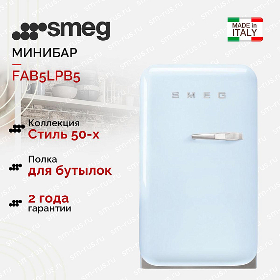 Минибар Smeg FAB5LPB5 из коллекции «Стиль 50-х годов» выполнен в голубом цвете и прекрасно дополнит интерьер в стиле ретро. Модель предусматривает в себе светодиодную подсветку, которая ярко освещает внутреннее пространство. Класс энергопотребления А+++ означает, что прибор потребляет на 30% меньше, чем устройства класса А.