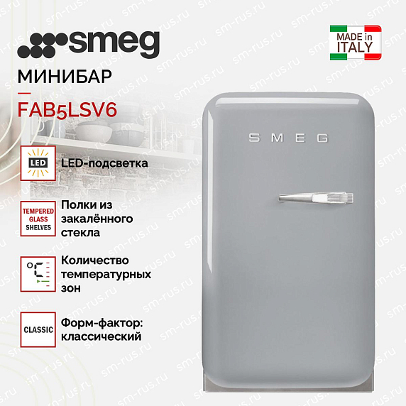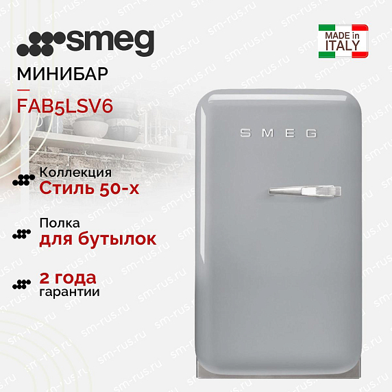 Минибар Smeg FAB5LSV6 выполнен в характерной стилистике пятидесятых годов и аккуратно сочетает винтажную эстетику с современными техническими решениями. Серебристое исполнение корпуса и соответствующая фурнитура придают изделию визуальную лёгкость и в то же время солидность, что делает его эффектной деталью интерьера, будь то кухня, гостиная или зона ресепшн. Классический форм‑фактор подчёркивает плавные округлые линии, доступные габариты обеспечивают удобство размещения в ограниченном пространстве: высота 74 см, ширина 40,4 см и глубина 50 см (с ручкой 56,9 см). Несмотря на компактность, общий объём составляет 34 литра, полностью используемый для хранения напитков и небольших продуктовых запасов; внутренняя камера также занимает 34 литра, что позволяет разместить несколько бутылок и контейнеров.