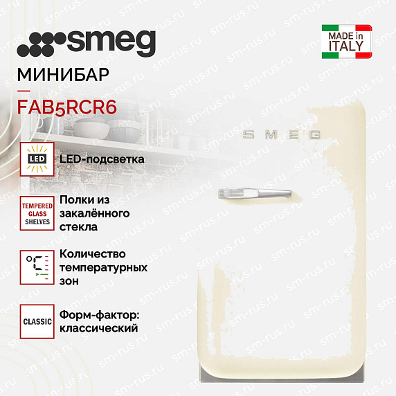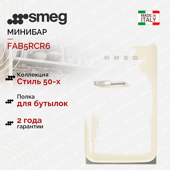 Минибар Smeg FAB5RCR6 вдохновлённый эстетикой пятидесятых, привлекает внимание плавными линиями и мягким кремовым тоном, который легко сочетается с интерьерами в стиле винтаж, сканди и современная классика. Серебристая фурнитура подчёркивает изящность фасада, добавляя благородный металлический акцент, при этом дизайн остаётся сдержанным и универсальным. Компактный классический форм-фактор обеспечивает аккуратное размещение в нише, на столе или рядом с рабочей зоной: высота 74 см при ширине 40.4 см и глубине 50 см (с ручкой 56.9 см) делает изделие удобным для малогабаритных помещений. Корпус и оформление коллекции «Стиль 50-х годов» продуманы так, чтобы мини-холодильник выглядел как часть мебельного ансамбля, а не просто бытовой прибор.