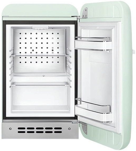 Минибар Smeg FAB5RPG5 представлен в зеленом цвете и станет прекрасным дополнением кухни вместе с другой техникой из коллекции «Стиль 50-х годов». Модель оснащена электронным управлением, которое гарантирует быструю настройку необходимых параметров. Светодиодная подсветка и стеклянные регулируемые полки обеспечивают комфорт эксплуатации.