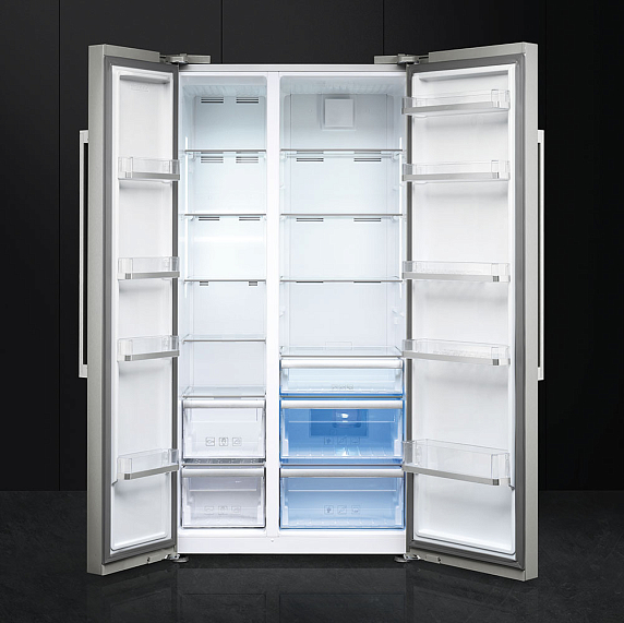 Smeg SBS63XE — отдельностоящий холодильник Side-by-Side с электронной системой управления. Модель работает по технологии NoFrost, благодаря чему исключается необходимость ручной разморозки. Для контроля параметров охлаждения предусмотрен информативный LCD-дисплей, практично вынесенный на дверцу устройства.