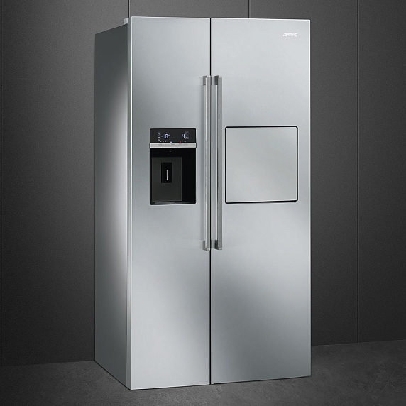 Smeg SBS63XEDH — двухкамерный холодильник Side-by-Side общим объемом 615 л. Модель оборудована льдогенератором HomeBar, подключаемым к водопроводной сети, с помощью которого можно с легкостью приготовить необходимое количество кубиков льда для охлаждения напитков. Наличие технологии NoFrost исключает необходимость ручного размораживания устройства.