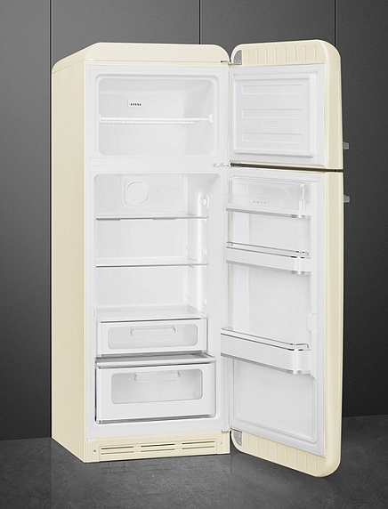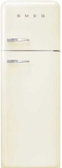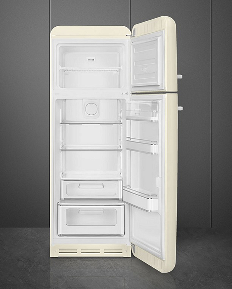 Холодильник SMEG FAB30RCR3 — модель из коллекции «Стиль 50-х годов» кремового цвета с серебристой фурнитурой. Прибор отличается правым упором двери от аналогичной модели FAB30LCR3. В ящике зоны свежести продукты сохраняются дольше, полки можно переставлять по высоте.