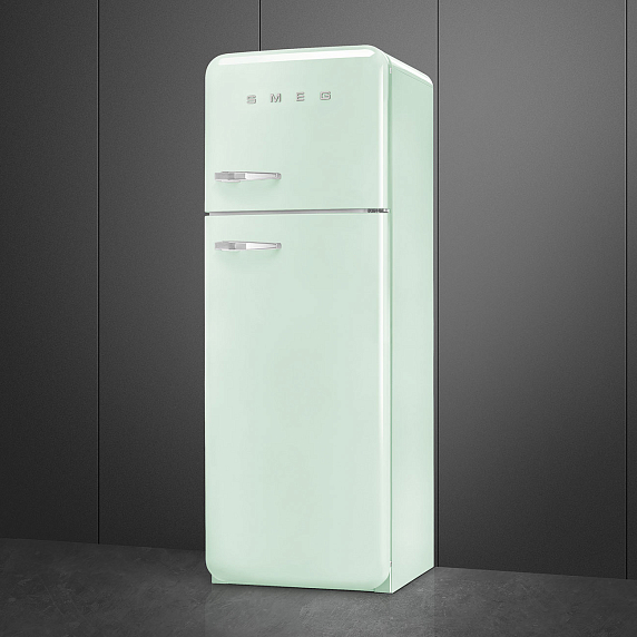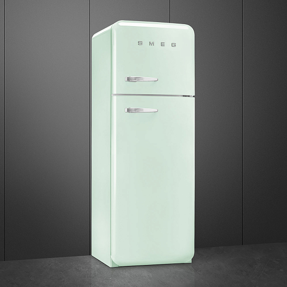 Холодильник SMEG FAB30RPG3 — модель из коллекции «Стиль 50-х годов» розового цвета с серебристой фурнитурой и большой ручкой. Благодаря автоматическому размораживанию холодильного отделения и светодиодному освещению удобен в эксплуатации. В отличие от моделей прошлого поколения прибор оснащен зоной свежести, в которой продукты сохраняются дольше.
