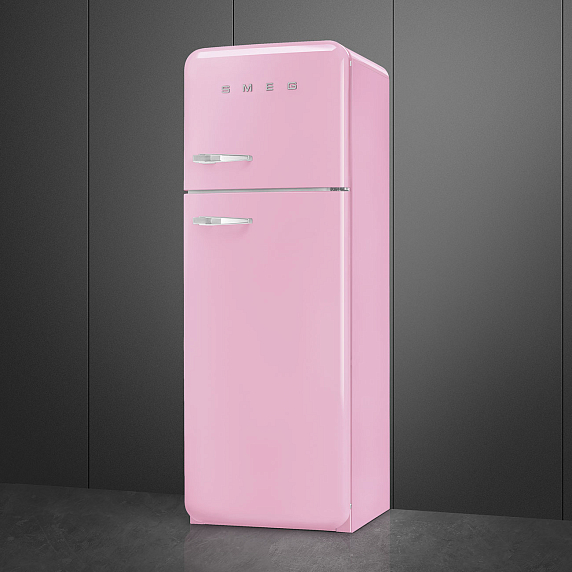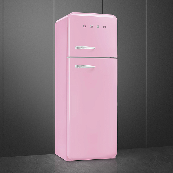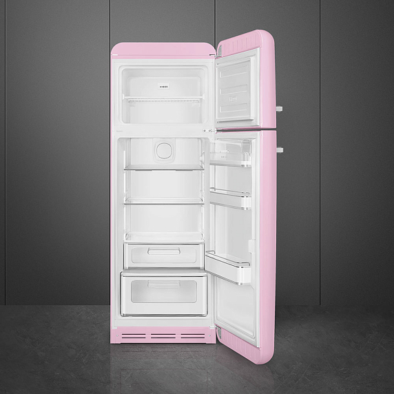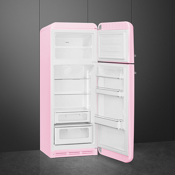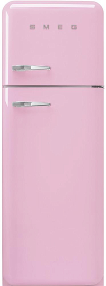 Холодильник SMEG FAB30RPK3 — модель из коллекции «Стиль 50-х годов» розового цвета с серебристой фурнитурой и большой ручкой. Дверца открывается направо. Прибор очень удобен благодаря автоматическому размораживанию холодильной камеры и светодиодному освещению. В ящике зоны свежести температура снижена, поэтому продукты сохраняются дольше.