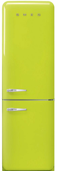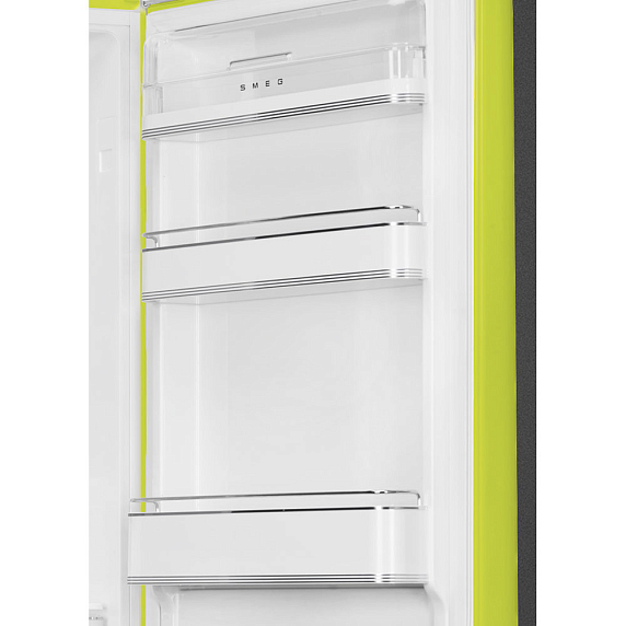 Холодильник SMEG FAB32RLI3 выполнен в цвете «лайм». При помощи трех переставляемых полок, в холодильное отделение поместится даже крупногабаритная посуда — внутреннее пространство можно отрегулировать под любой объем. Благодаря системе NoFrost прибор не требует разморозки, так как камеры защищены от обледенения. Комфорт эксплуатации также гарантируют LED-подсветка, функция «суперзаморозка» и электронное управление.