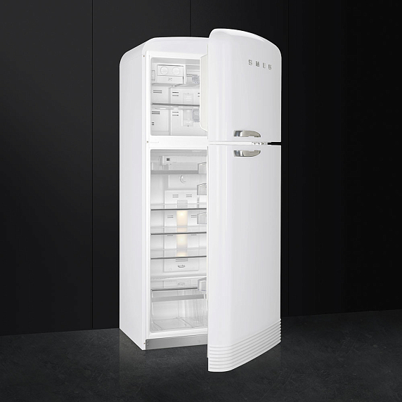 Smeg FAB50RWH — отдельностоящий холодильник в классическом белом корпусе. Камерные дверцы модели возможно перенавесить, изменив тем самым сторону их открывания. Система NoFrost, реализованная в обоих отделениях устройства, исключает необходимость ручной разморозки.