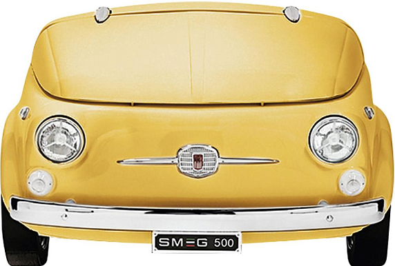Минибар Fiat выпускается для хранения напитков и закусок. Такой холодильник выполнен в виде передней части кузова автомобиля «Фиат» и выпущен совместно с автоконцерном. Помимо знаменитого лого, в оформлении можно найти номерной знак, фары, панель и держатель капота, под которым скрывается минибар.