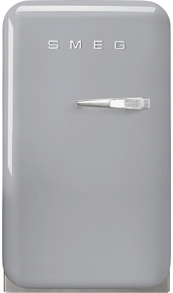Отдельностоящий минибар Smeg FAB5LSV3 серебристого цвета оснащен регулируемым термостатом (от 4°С до 10°С) и функцией автоматического размораживания. Уровень шума при работе — 40 дБ. Полезный объем 34 л.