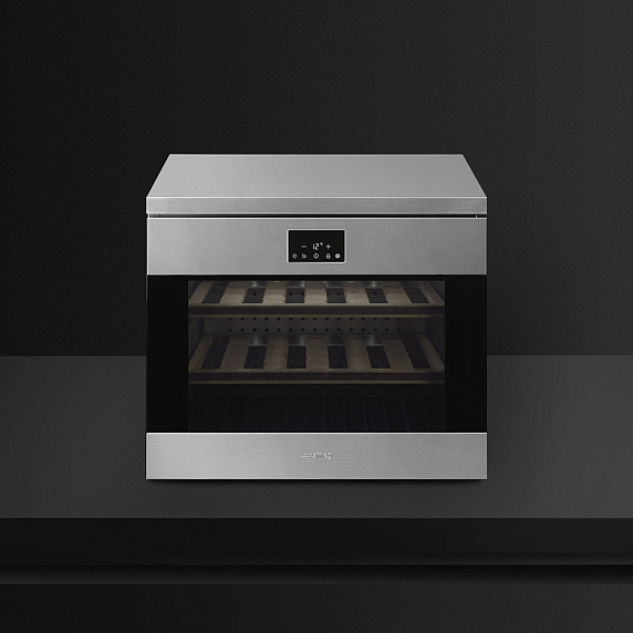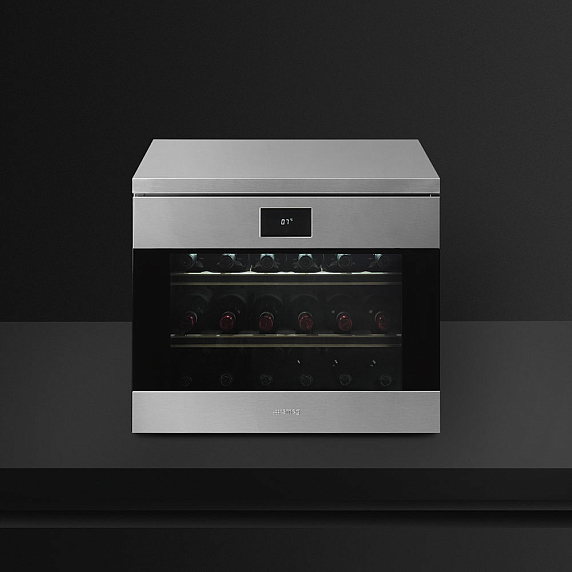 Холодильный шкаф для вина Smeg CVF318X выполнен из нержавеющей стали с покрытием против отпечатков пальцев, что способствует легкой очистке прибора. Дверца выполнена из стекла черного цвета, которое исключает проникновение ультрафиолетовых лучей внутрь камеры. LED-дисплей отображает информацию о ходе работы. Температуру можно отрегулировать при помощи сенсорных переключателей.