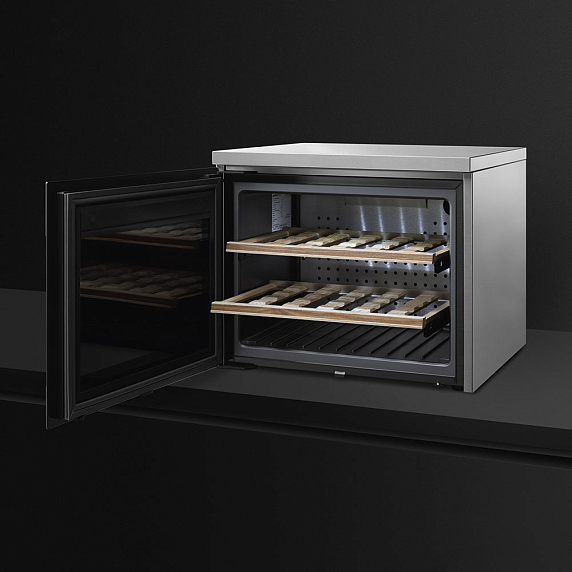 Холодильный шкаф для вина Smeg CVF318XS из нержавеющей стали с покрытием против отпечатков пальцев имеет дверцу, стекло которой предотвращает проникновение ультрафиолетовых лучей. Угольный фильтр обеспечивает чистота и свежий воздух внутри камеры. LED-дисплей отображает информацию о ходе работы. Температуру регулируется максимально точно при помощи сенсорных переключателей. Петли дверцы расположены слева.