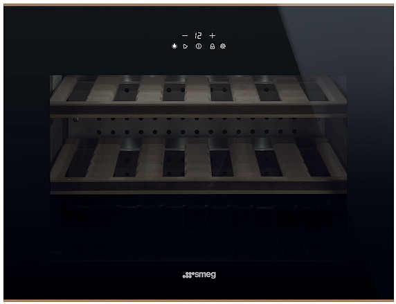 Холодильный шкаф для вина Smeg CVI618NRS из коллекция Dolce Stil Novo в черном цвете дополнен профилем из нержавеющей стали. Внутренний объем в 45 литров умещает до 18 бутылок стандартной емкости 0.75 л. Надежные деревянные полки регулируются по высоте, а специальное стекло исключает возможность проникновения ультрафиолетовых лучей.