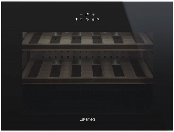 Холодильный шкаф для вина Smeg CVI618NX из коллекция Dolce Stil Novo в черном цвете органично украшен профилем из нержавеющей стали. Специальное стекло исключает вероятность проникновение ультрафиолетовых лучей внутрь. Камера объемом 45 литров предусматривает наличие двух деревянных полок, где легко уместятся 18 стандартных бутылок вина.