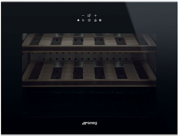 Холодильный шкаф для вина Smeg CVI618NXS имеет специальное защитное от ультрафиолетовых лучей стекло для надежного хранения напитков. Модель в черном исполнении дополнена стальным профилем, что позволяет ей органично вписаться в современный кухонный Hi-Tech интерьер. Камера объемом 45 литров предусматривает наличие двух деревянных полок, где легко уместятся 18 стандартных бутылок вина.