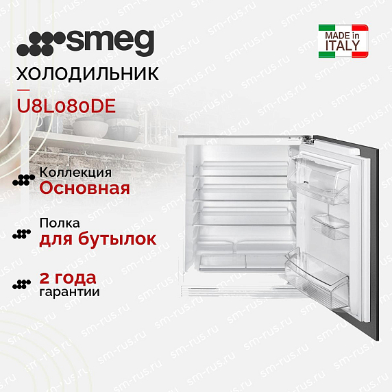 Встраиваемый однокамерный холодильник Smeg U8L080DE — это компактная модель под столешницу, высотой 82 см. Вариант чисто для тех, кому нужно сэкономить место или добавить вторую точку хранения на кухне. Он полностью встраивается в шкаф, фасад крепится жестко (техника «плоское крепление»), так что дверца сидит плотно. Сборка качественная, внутри всё распределено толково для таких габаритов.