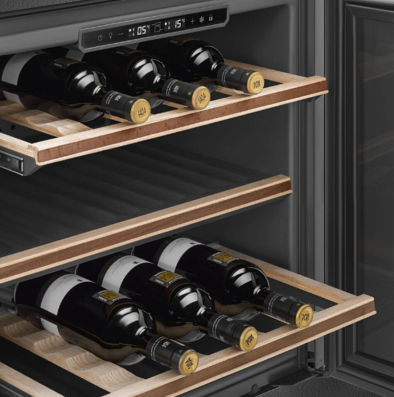 Деревянные полки в винных шкафах обычно изготавливаются из дуба или других ценных пород древесины. Они не только удобны и выглядят благородно, но и позволяют правильно хранить бутылки. Также полки оснащены телескопическими направляющими, чтобы было проще укладывать и доставать напитки.