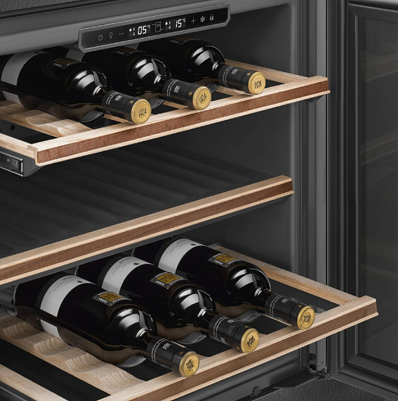Деревянные полки в винных шкафах обычно изготавливаются из дуба или других ценных пород древесины. Они не только удобны и выглядят благородно, но и позволяют правильно хранить бутылки. Также полки оснащены телескопическими направляющими, чтобы было проще укладывать и доставать напитки.