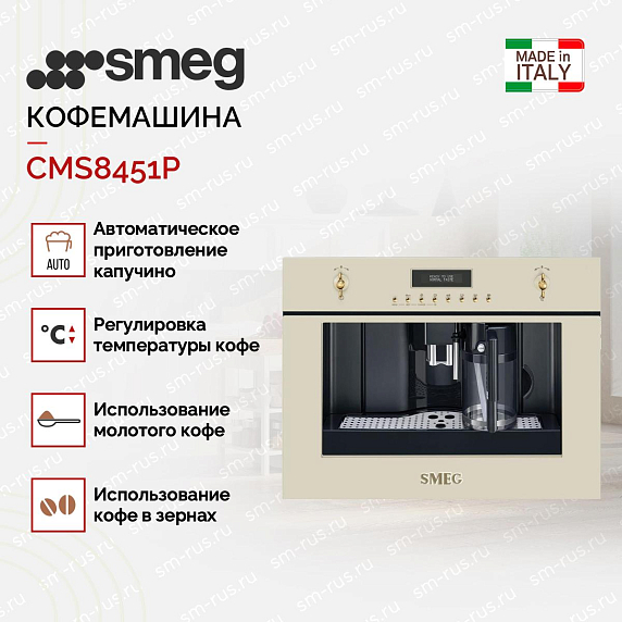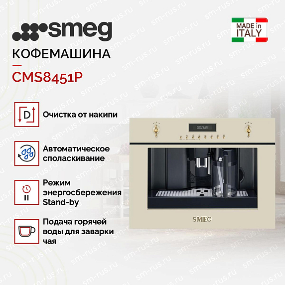 Прибор готовит разные виды кофе и подогревает воду для заваривания чая. Устройство быстро прогревается: утром не придется долго ждать, чтобы сварить первую чашку капучино. Режим Stand by позволяет держать технику включенной, но экономить электроэнергию. Чистить кофемашину Смег CMS8451P вручную не придется — процесс автоматизирован. Пользователю только нужно выбрать режим очистки и положить в резервуар специальную таблетку, упаковку которых можно приобрести в нашем магазине. Система ополаскивания удаляет кофейные масла после каждого использования, чтобы вкус напитков не менялся. Присутствует система автоматического включения по времени: Смег приготовит кофе к моменту вашего пробуждения. Автоматический капучинатор избавляет от необходимости взбивать молоко в пену вручную. Также есть полезная функция подогрева кружек.
