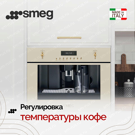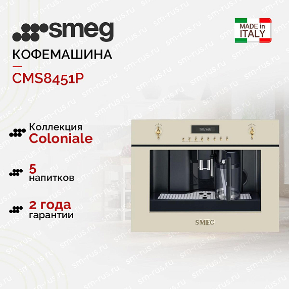 Встраиваемая кофемашина Smeg CMS8451P — автоматическая модель из серии Coloniale, которая сочетает в себе элементы современного и ретро-стиля. Фасад кремового цвета эффектно смотрится на любой кухне. Поворотные переключатели и кнопки оформлены под латунь. Ими удобно пользоваться: менять программу, крепость напитка или регулировать объем жидкости. Электронный дисплей отображает меню прибора и выбранные пользователем настройки.