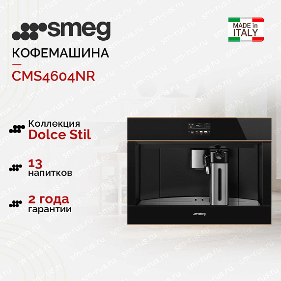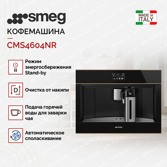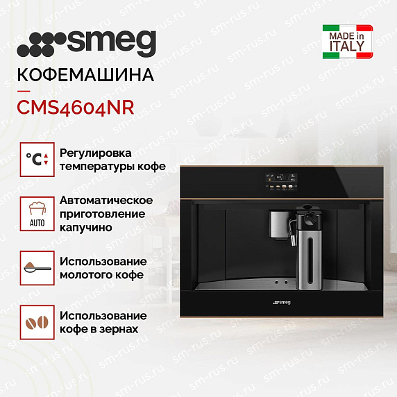 Кофемашина Smeg CMS4604NR представляет собой уникальное сочетание элегантности и функциональности. Изготовленная в Италии, модель отличается высоким качеством исполнения и продуманным дизайном. Черное стекло и медный профиль придают ей стильный и современный вид, который станет изысканным дополнением к любому интерьеру.