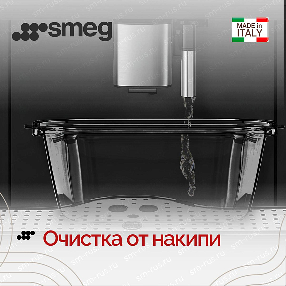 Умные кофемашины Smeg способны сами ухаживать за собой, в частности, осуществлять автоматическое споласкивание рабочих поверхностей после приготовления напитка. Несколько автоматических ополаскиваний с паузами входит и в цикл удаления накипи.