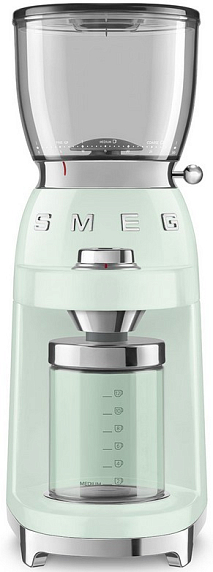 Кофемолка Smeg CGF01PGEU представлена в зеленом цвете и прекрасно дополнит кухню вместе с другой техникой из коллекции «Стиль 50-х годов». Модель предусматривает в себе удобное управление, при помощи которого можно быстро настроить подходящую степень помола и отрегулировать количество кофе. Корпус из нержавеющей стали обеспечивает долговечность эксплуатации.