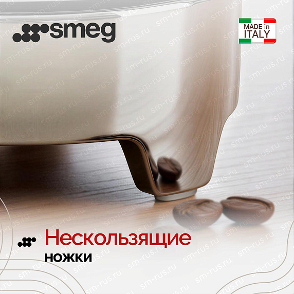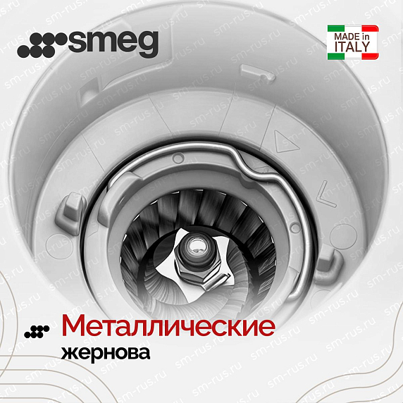 Кофемолка SMEG CGF03WHEU — выразительный аксессуар в белом цвете, выдержанный в эстетике коллекции Стиль 50-х годов; сочетание пластика и нержавеющей стали формирует устойчивый к повседневной эксплуатации облик, а компактные габариты позволяют разместить прибор на любой кухонной поверхости. Панель управления включает кнопки, ручку и рычаг для интуитивной эксплуатации, а ручная регулировка и опция настройки количества порции дают полный контроль над процессом. Емкость для зерен рассчитана на 240 г, а контейнер для молотого оснащён системой Twist & Lock для аккуратного хранения; материал последнего — Tritan™, стойкий к запахам и механическим воздействиям. Система жерновов выполнена из нержавеющей стали, есть съёмный верхний элемент и съёмная опорная плата для удобства чистки; антистатическая технология снижает оседание частиц, а нескользящие ножки обеспечивают стабильность при работе.