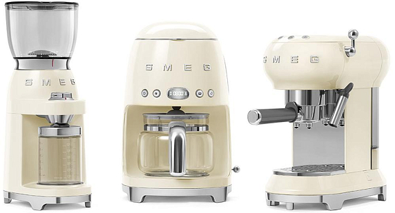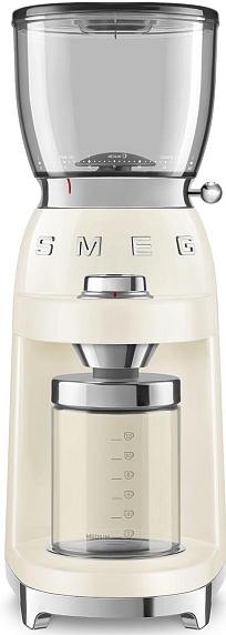 Кофемолка Smeg CGF11CREU — модель кремового цвета из линейки «Стиль 50-х г.г.» Материал корпуса выполнен из литого под давлением алюминия и конические жернова из нержавеющей стали, который сохранит все оттенки аромата приготовленного кофе. При помощи удобного рычага можно выбрать до 30 разных уровней помола, благодаря чему можно отрегулировать количество нужного напитка.