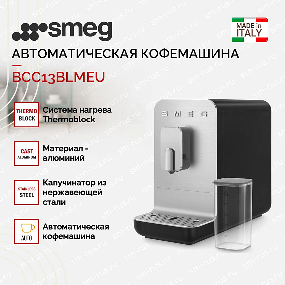 Кофемашина Smeg BCC13BLMEU — это компактный автомат из обновленной линейки в матовом черном цвете. Она узкая, всего 18 см в ширину, так что втиснуть можно на любую полку. Корпус матовый с алюминиевой отделкой на передней панели, смотрится солидно и не так сильно ляпается, как глянец.