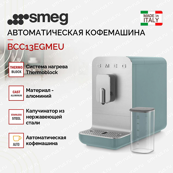 С помощью автоматической кофемашины SMEG BCC13EGMEU можно приготовить разнообразные напитки: горячую воду, кофе, американо, кофе лонг, эспрессо и эспрессо лайт. Мощность устройства составляет 1.35 кВт, а давление — 19 бар. Гарантийный срок службы кофемашины составляет 12 месяцев.