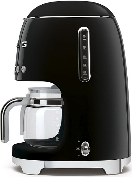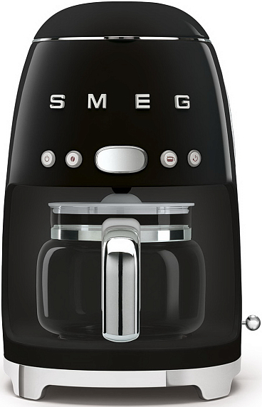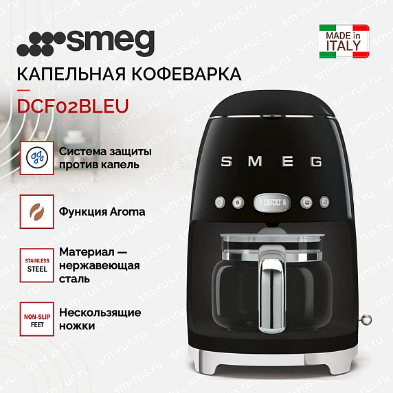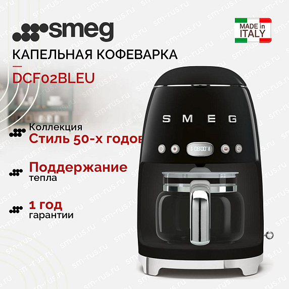 Капельная кофеварка Smeg DCF02BLEU — модель черного цвета из серии «Стиль 50-х годов». Прибор имеет удобную панель управления, большой резервуар для воды и кувшин для кофе на 10 чашек. Крепость напитка можно регулировать.