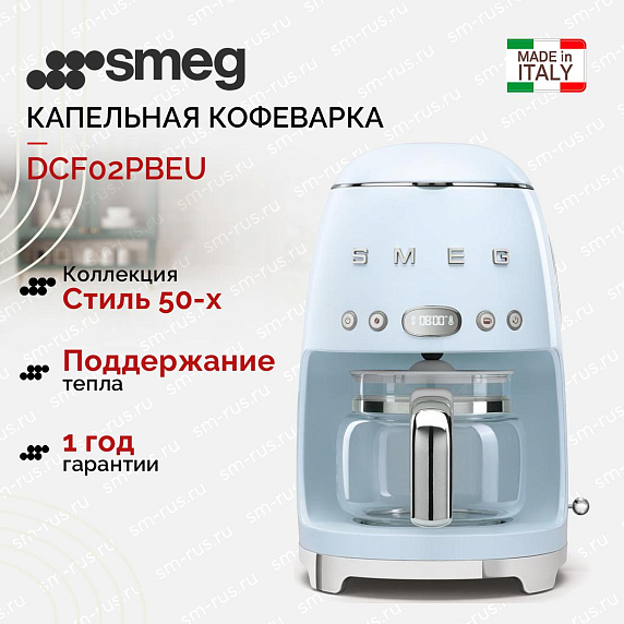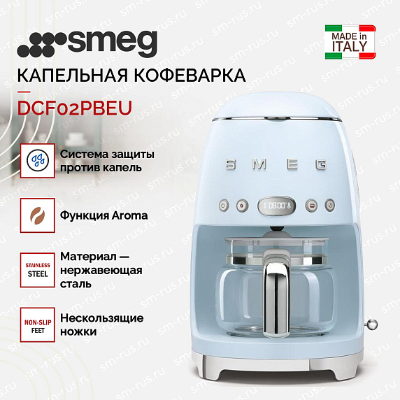 Капельная кофеварка Smeg DCF02PBEU — модель пастельного голубого цвета из коллекции в стиле 50-х годов. Прибор имеет вместительный резервуар для воды объемом 1,4 литра и удобную панель управления. При помощи специальной функциии Aroma можно регулировать крепость кофе. Температура напитка поддерживается в течение 20 минут.