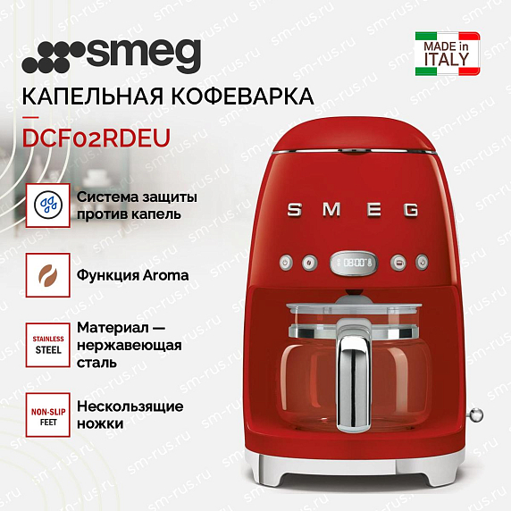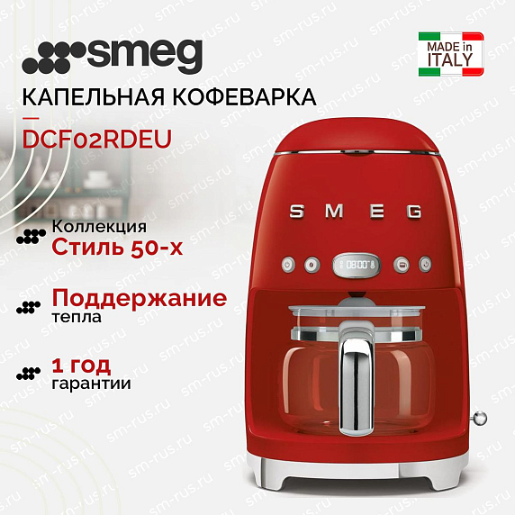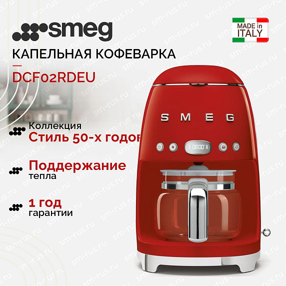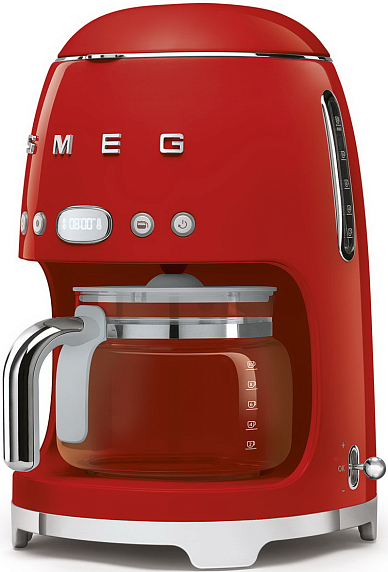 Капельная кофеварка Smeg DCF02RDEU — модель красного цвета из коллекции в стиле 50-х годов. Прибор имеет полностью металлический корпус, удобную панель управления и большой стеклянный кувшин с крышкой. Режим Aroma позволяет регулировать крепость кофе.