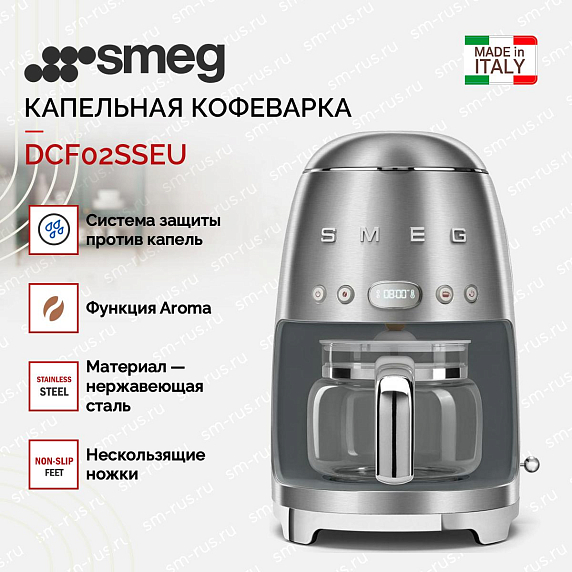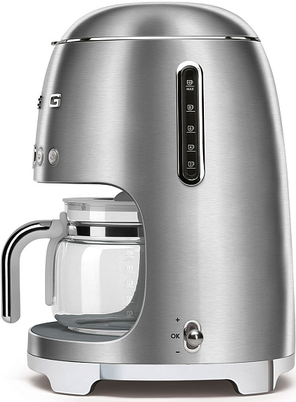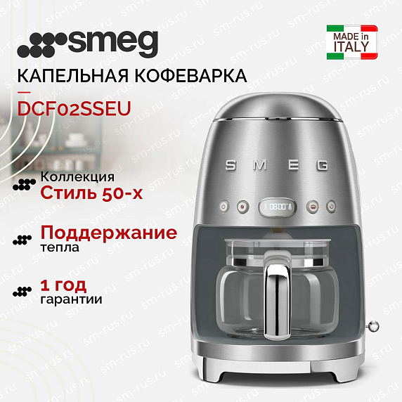 Капельная кофеварка Smeg DCF02SSEU — модель из серии «Стиль 50-х годов». Прибор имеет удобную панель управления и стеклянный кувшин на 10 чашек. Крепость кофе можно регулировать. Напиток сохраняет температуру до 20 минут.