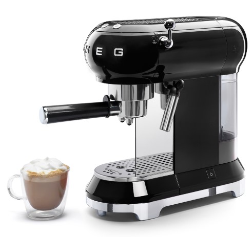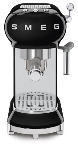Smeg ECF01BLEU — настольная кофемашина в оригинальном ретро-стиле. Элегантный черный корпус устройства дополнен практичным лотком для сбора капель, служащим комфортному размещению чашек.