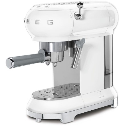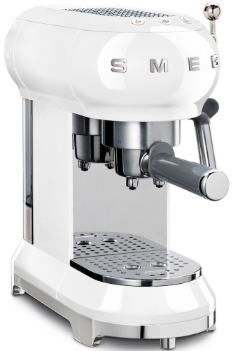 Кофемашина-эспрессо Smeg ECF01WHEU выполнена в белом цвете и прекрасно будет смотреться в интерьере вместе с другой техникой из серии «Стиль 50-х годов». Панель управления прибора оснащена тремя кнопками для выбора требуемых настроек. Для комфортного размещения чашек предусмотрена съемная подставка из нержавеющей стали. Индикация необходимости программы очистки от накипи показывает, когда нужно провести чистку устройства.