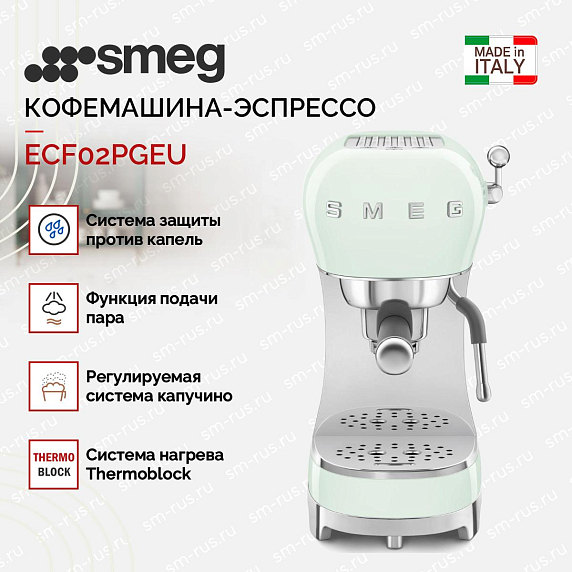 Кофемашина Espresso Smeg ECF02PGEU — это высококачественное устройство для приготовления кофе, произведенное в Италии. Она привлекает внимание своим стильным дизайном в стиле 50-х годов и пастельно-зеленым цветом, который добавит изысканности и уникальности в любую кухню. Корпус из нержавеющей стали и пластика гарантирует долговечность и надежность использования.