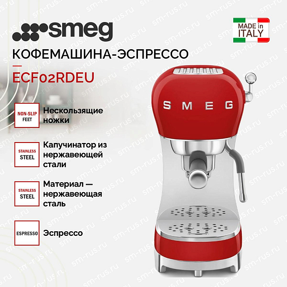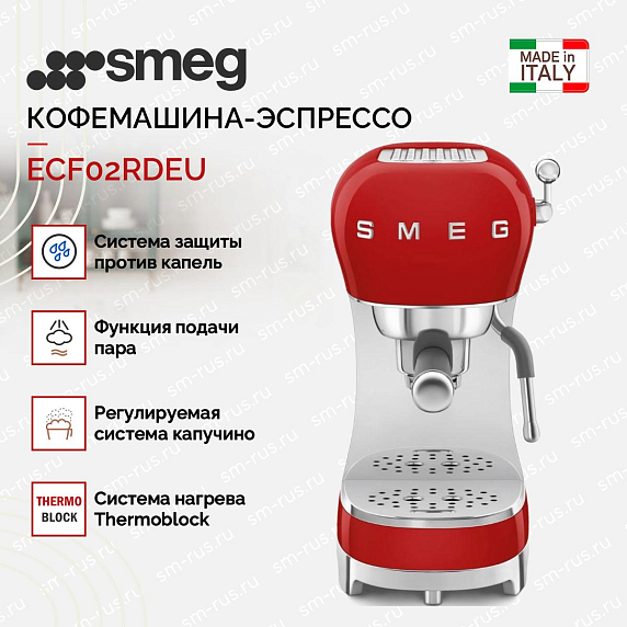 Кофемашина-эспрессо SMEG ECF02RDEU — это стильная и функциональная модель, которая привнесет в вашу жизнь настоящий вкус эспрессо. Модель выполнена в ретро-стиле 50-х годов, что придает ей особый шарм и неповторимый облик. Красный цвет корпуса, выполненного из нержавеющей стали и пластика, придает этой модели яркость и современность. Система нагрева Thermoblock обеспечивает быстрый нагрев и поддержание оптимальной температуры воды для заваривания кофе. Вместительный резервуар для воды объемом 1,1 литра позволяет приготовить несколько порций кофе без необходимости доливать воду.
