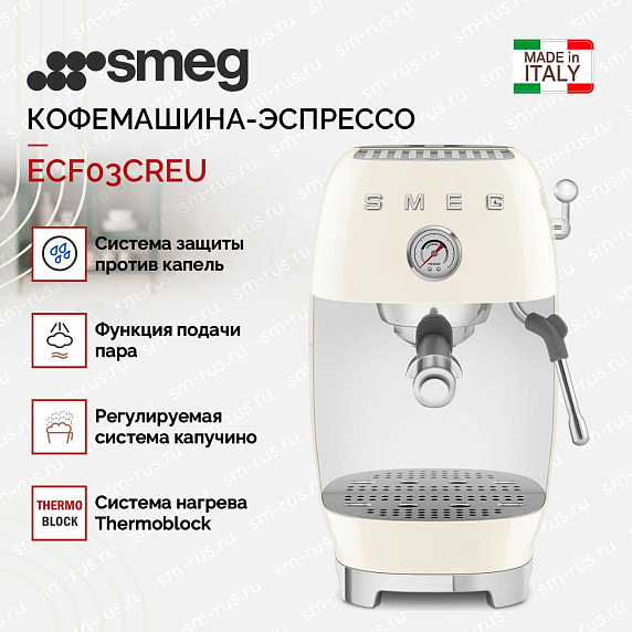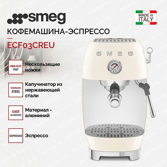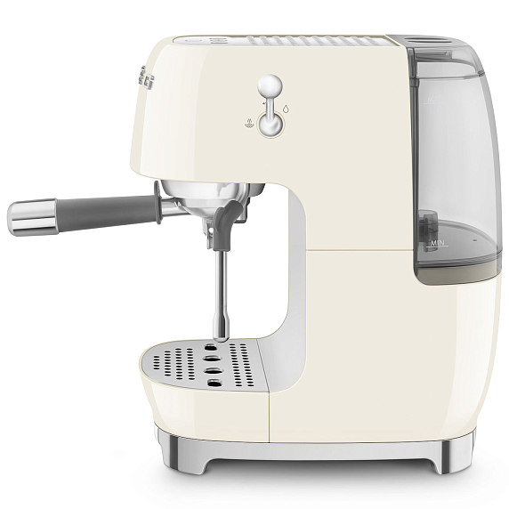 Кофемашина-эспрессо Smeg ECF03CREU в духе коллекции «Стиль 50-х годов» служит эффектным интерьерным акцентом на кухне. Лаконичные округлые формы сочетаются с ретро-линиями, а материалы — алюминий в сочетании с практичным пластиком — обеспечивают легкий вес и долговечность. Основание выполнено из пластика, что снижает нагрузку на поверхность и упрощает обслуживание. Ножки с антискользящим покрытием надежно фиксируют прибор, предотвращая смещение во время эксплуатации. Панель управления представлена удобными кнопками, понятными при любом уровне подготовки, а интуитивная схема работы сокращает время на настройку.