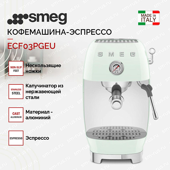 Кофемашина-эспрессо Smeg ECF03PGEU воплощает стиль 50-х годов в современном исполнении: корпус из алюминия и пластика окрашен в мягкий пастельно-зеленый оттенок, который придает прибору ретро-шарм и одновременно делает его эффектным акцентом на кухне. Продуманная геометрия, аккуратные хромированные детали и плавные линии создают ощущение винтажной элегантности, не теряющей актуальности благодаря технологичным решениям. Небольшие габариты (высота 36.4 см, ширина 20.5 см, глубина 29.5 см) позволяют компактно разместить агрегат даже в ограниченном рабочем пространстве, а пластиковое основание и нескользящие ножки обеспечивают устойчивость и защиту столешницы.