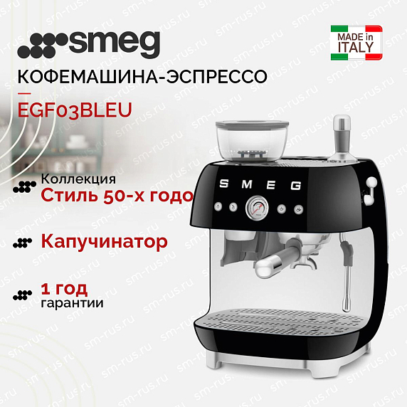 Кофемашина-эспрессо Smeg EGF03BLEU выполнена в черном цвете в корпусе из литого алюминия и пластика. Добиться идеальных результатов приготовления можно с помощью регулировки температуры и размера порции кофе, регулировка жесткости воды, а также встроенная кофемолка. Акустический сигнал предупредит вас о том, что прибор необходимо очистить от накипи.