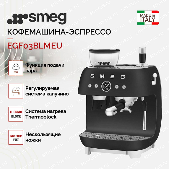 Кофемашина эспрессо Smeg EGF03BLMEU — это идеальное сочетание элегантного дизайна и продуманной функциональности. Её черный корпус, выполненный из комбинации алюминия и пластика, придаёт прибору солидный и утончённый вид, одновременно обеспечивая лёгкость конструкции и высокую прочность. Алюминиевые детали подчёркивают ретро-стилистику, вдохновлённую золотой эпохой дизайна, а пластиковые элементы эффективно снижают теплопроводность в критических зонах, делая эксплуатацию безопасной и комфортной. Основание изготовлено из прочного пластика, что обеспечивает устойчивость на любой поверхности, а нескользящие ножки надёжно фиксируют кофемашину на столешнице, исключая риск смещения во время работы.