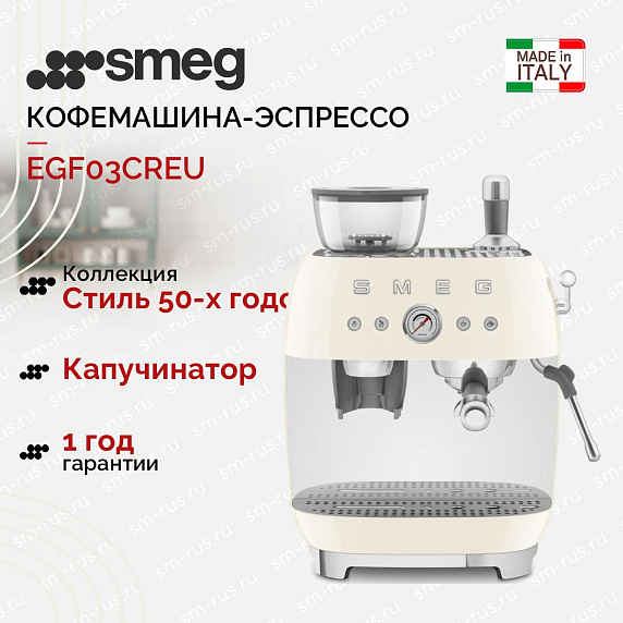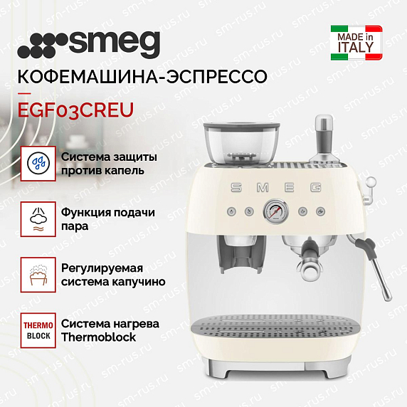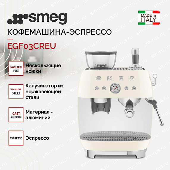 Кофемашина Espresso Smeg EGF03CREU — это сочетание стиля, функциональности и высокого качества. Относящаяся к коллекции «Стиль 50-х годов», она обладает элегантным кремовым цветом корпуса, выполненного из комбинации алюминия и пластика. Этот дизайнерский подход придает технике неповторимый винтажный облик, подчеркивая ее уникальность и индивидуальность.