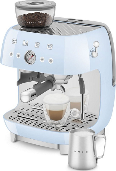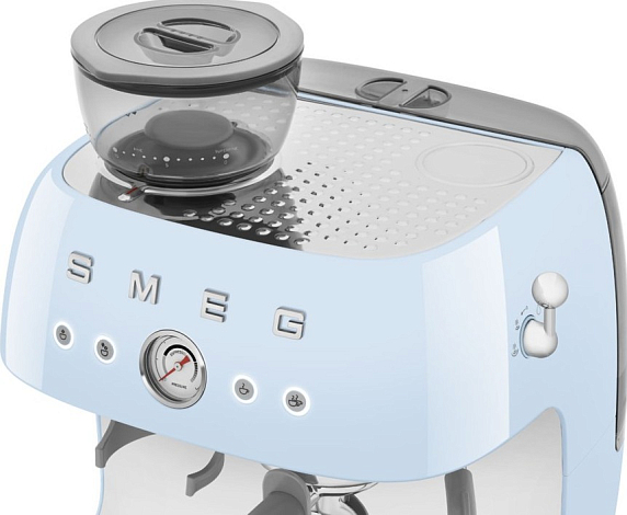 Smeg EGF03PBEU — стильная эспрессо-кофемашина, выполненная в пастельном голубом цвете. В качестве нагревательного элемента используется двойной термоблок — специальный механизм, обеспечивающий порционную подготовку воды. Для равномерного помола, при котором сохраняются все ароматы напитка, предусмотрена встроенная кофемолка. Управление устройством осуществляется при помощи кнопок и рычага. Капучинатор выполнен из нержавеющей стали.