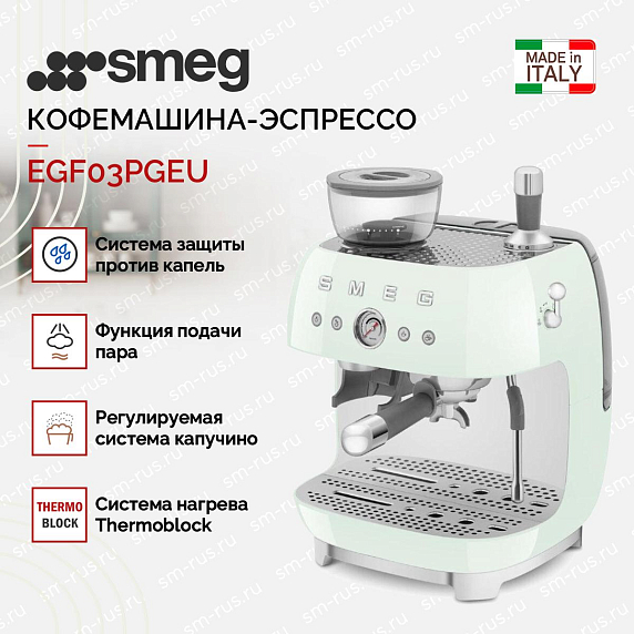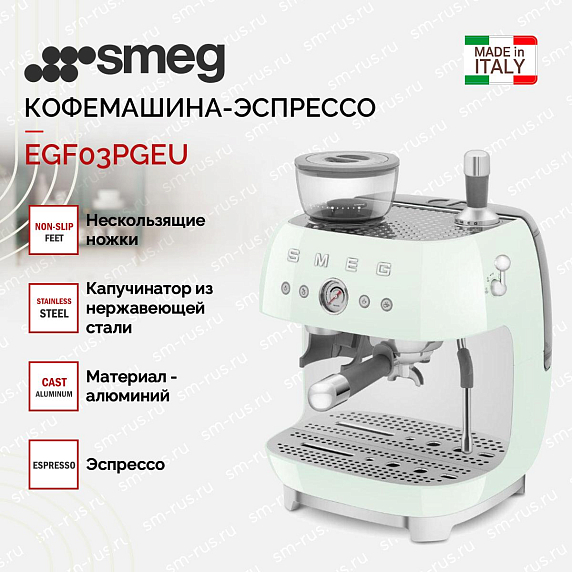 Smeg EGF03PGEU — стильная эспрессо-кофемашина, выполненная в пастельном зеленом цвете. Управление устройством осуществляется при помощи кнопок и рычага. Для равномерного помола, при котором сохраняются все ароматы напитка, предусмотрена встроенная кофемолка. Капучинатор выполнен из нержавеющей стали.