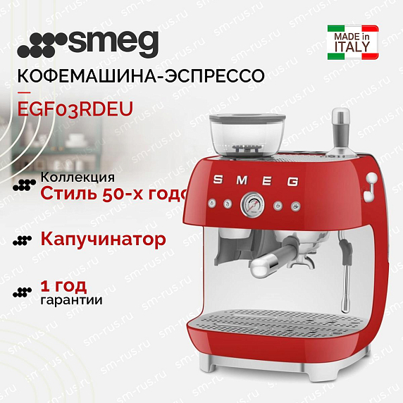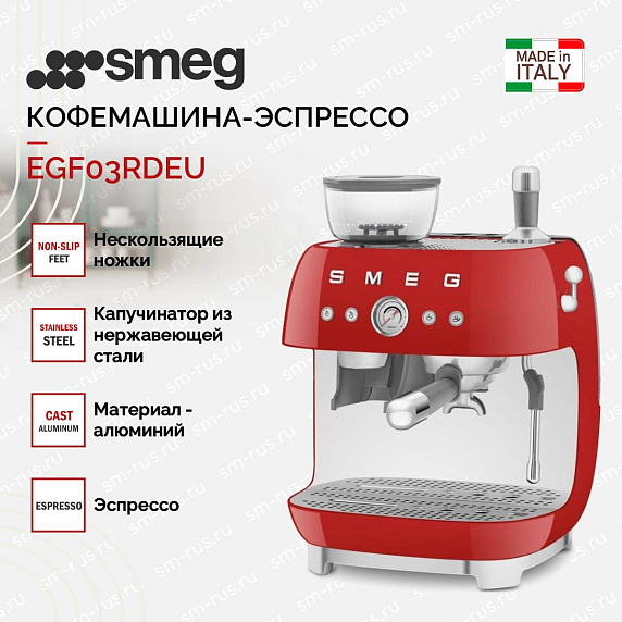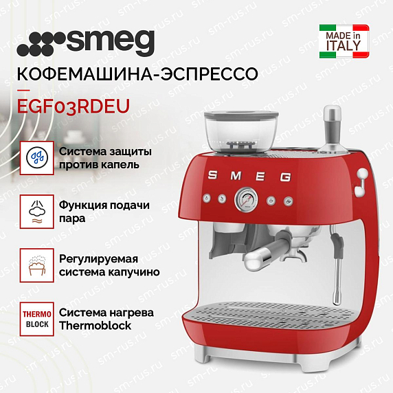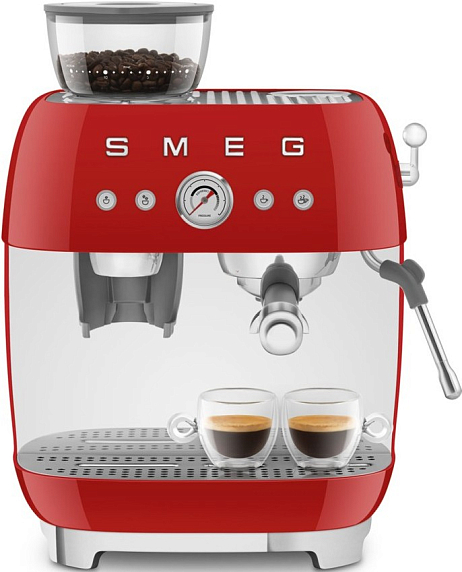 Smeg EGF03RDEU — эспрессо-кофемашина, выполненная в красном цвете. В качестве нагревательного элемента используется двойной термоблок — специальный механизм, обеспечивающий порционную подготовку воды. Для равномерного помола, при котором сохраняются все ароматы напитка, предусмотрена встроенная кофемолка. Благодаря держателю фильтра диаметром 58 мм и паровой трубке с двумя интенсивностями подачи пара можно готовить кофе и напитки на основе молока.