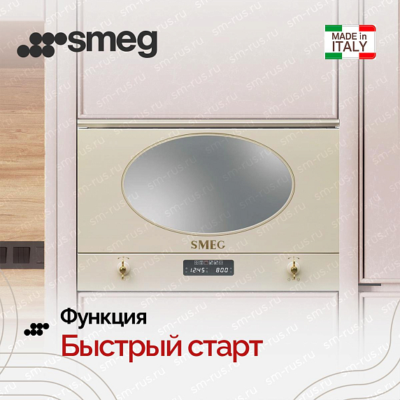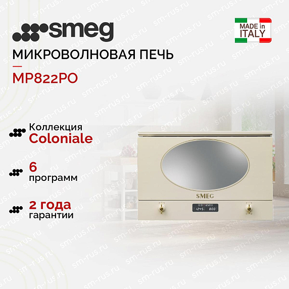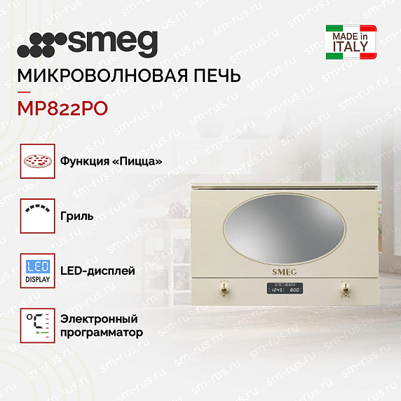 Микроволновая печь Smeg MP822PO представлена в элегантном кремовом цвете. Латунные переключатели гармонично дополняют внешний вид. Благодаря спокойному лаконичному дизайну модель органично интегрируется в любой интерьер. Внутренняя камера изготовлена из нержавеющей стали, в связи с чем, отличается прочностью и долговечностью в эксплуатации. Функция «Быстрый старт» активирует необходимый режим без предварительной подготовки. автоматическое отключение и блокировка от детей обеспечивают безопасность при эксплуатации. Программа «Пицца» позволяет приготовить любимое блюдо на профессиональном уровне. Электронный контроль температуры создает дополнительный комфорт при использовании.